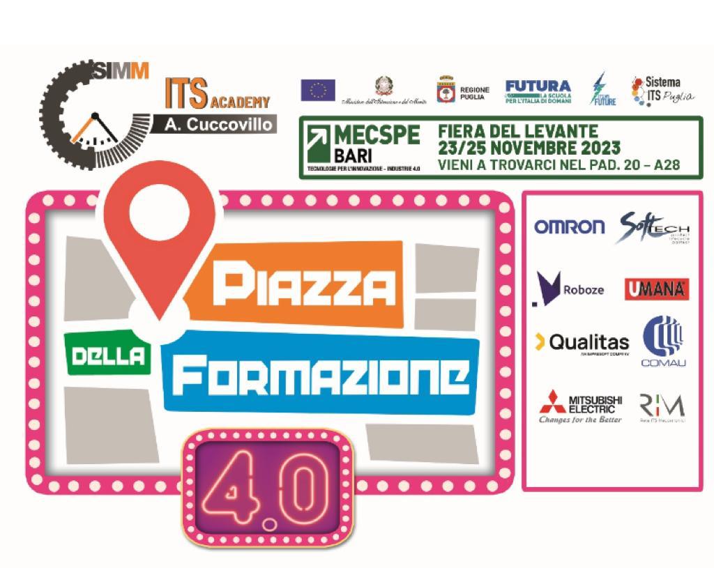 Per l’occasione, FONDAZIONE ITS A. CUCCOVILLO ha creato la Piazza della Formazione 4.0, uno spazio dove gli studenti dell’ITS Meccatronica e le aziende Partner racconteranno la propria collaborazione e le opportunità per il Territorio. Dimostreranno quanto sia fondamentale per le aziende poter contare su giovani futuri lavoratori dalle competenze innovative e trasversali, proprio la formazione che il Sistema ITS Puglia si propone di fornire agli studenti di tutti i suoi percorsi!