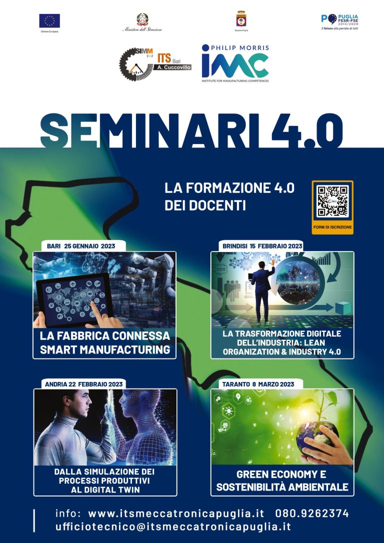 Gli interessati potranno confermare la partecipazione iscrivendosi al seguente link: SEMINARI 4.0, o sul sito www.itsmeccatronicapuglia.it.